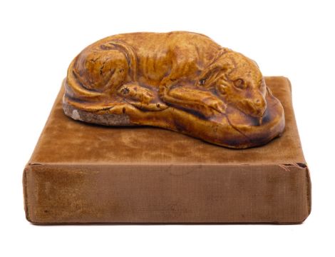 A press moulded pottery figure of a recumbent hound, under pale treacle glazes, 9.5cm long.