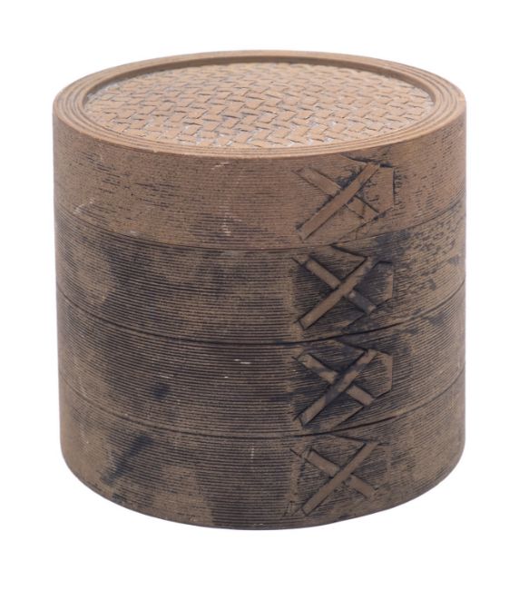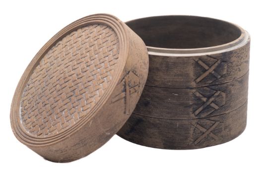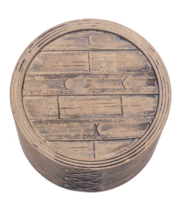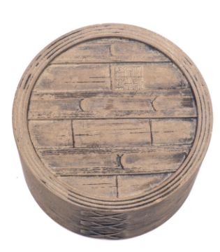 A Chinese Yixing stoneware jar and cover in imitation of a rattan rice container, impressed seal mark to base, 10cm high.