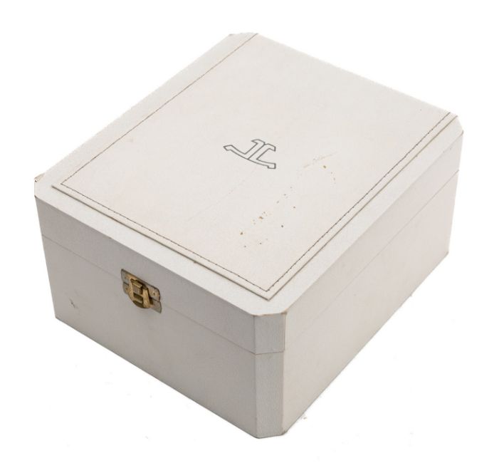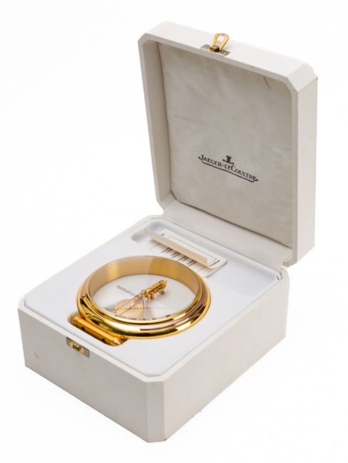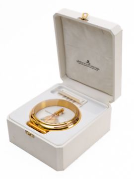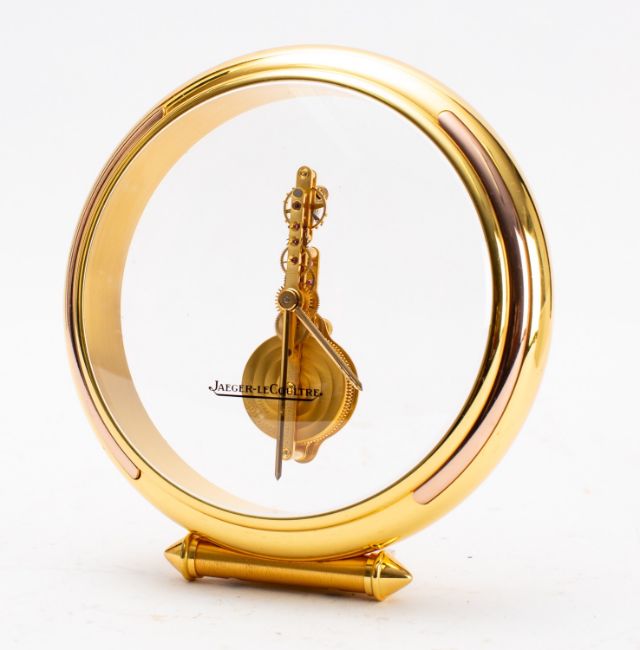Jaeger-LeCoultre a circular gilt-brass and perspex mantel clock having an eight-day duration jeweled skeletonised in-line movement with a lever escapement, the barrel signed Jaeger-LeCoultre, Swiss and numbered 215.019, the round gilt-brass and perspex case signed to the front and standing on a scroll base, height 10cm. Complete with white leather case and undated International Guarantee,