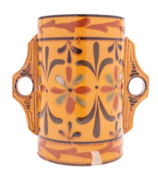 An Aller Vale Torquay pottery two handled cup decorated with stylised daisies and verso 'Torbay Nov 5th 1658, The liberties of England & the Protestant religion I will maintain', 15cm high, [flake chip,].