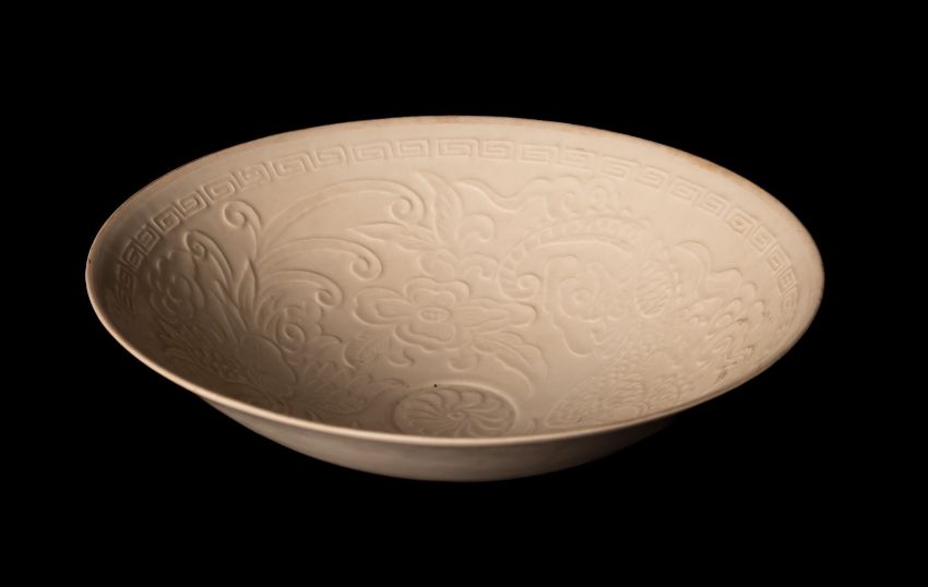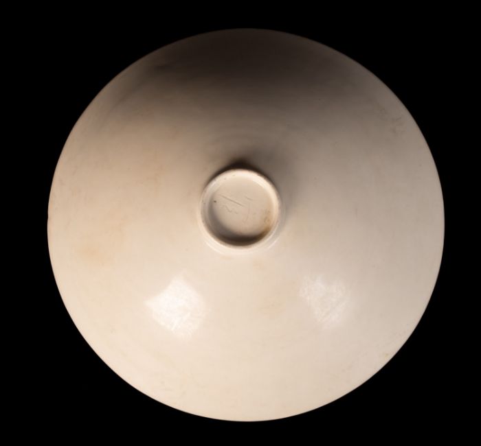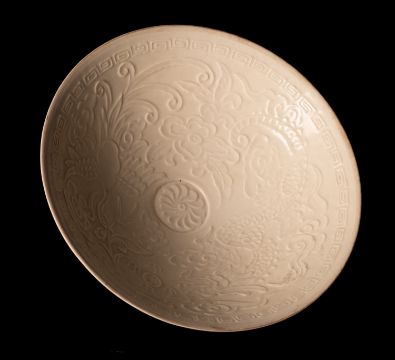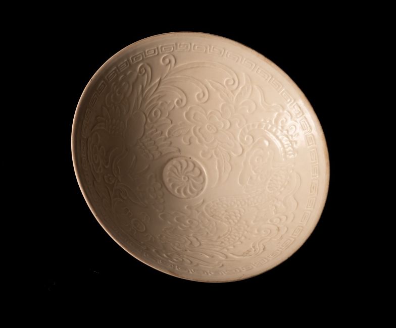 A Chinese Ding-ware 'Dragon' bowl, Song dynasty of conical form with short footrim, the interior moulded with a dragon chasing the sacred pearl amongst cloud scrolls, flowers and foliage, incised mark, 20cm.