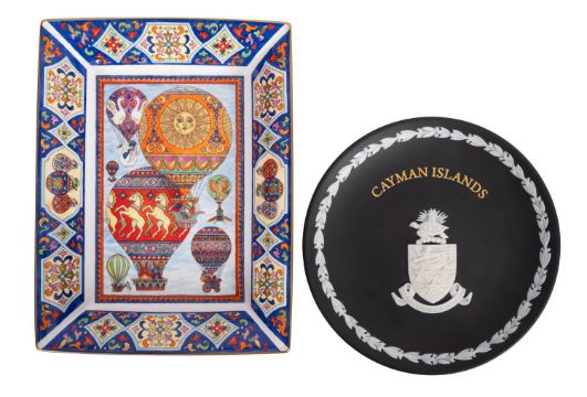 A Royal Worcester porcelain rectangular tray decorated in the Flights of Fancy pattern, 22cm long, boxed together with a Wedgwood black basalt dish sprigged in white with the arms of the Cayman Islands, 17cm diameter. [2]