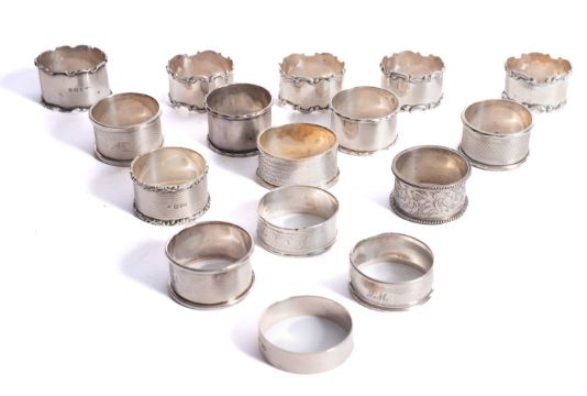 A mixed group of sixteen silver napkin rings; various dates and maker, 300gms. (9ozs), gross, (16)