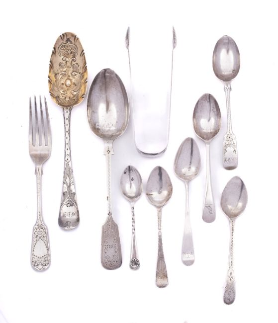 A mixed group of silver flatware including; a George III silver berry spoons marks rubbed, a Fiddle pattern table spoon, six various tea spoons, a pair of brightcut sugar tongs and a dessert fork, 293gms. (9.4ozs.), gross, (10)