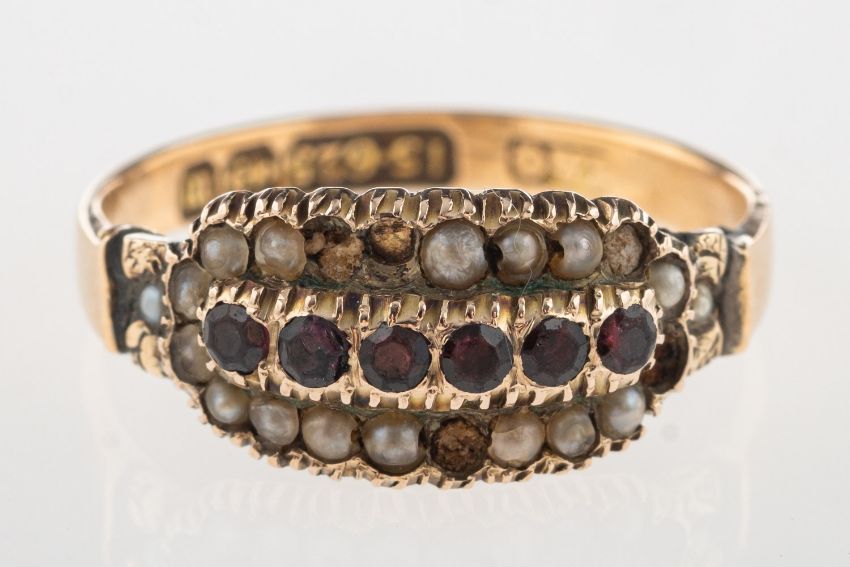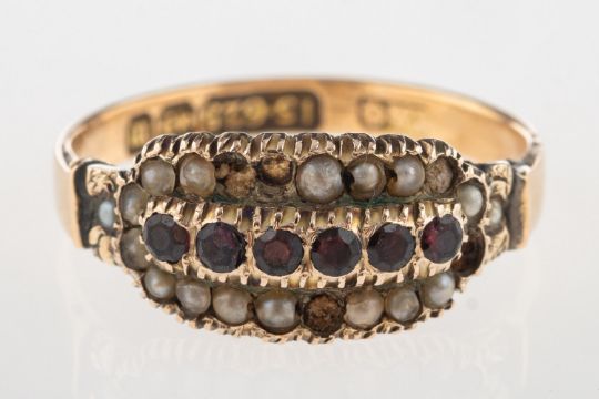 A 15ct gold Victorian ring, set with a row of red circular-cut stones with a row of seed pearls either side (some seed pearls missing), enclosed back setting, UK hallmark, 1896, size approx. N,(shoulder split from head setting on one side), 2.3grams. (Note: red stones very rubbed and damaged, seed pearls damaged and some missing, shoulder has come away from head setting on one side).