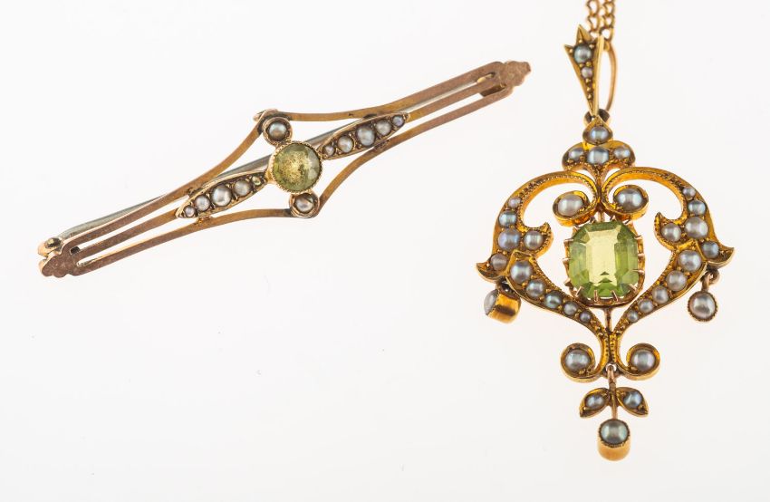 A Victorian peridot and seed pearl pendant with chain and brooch, the pendant of ornate openwork design, claw set with a rectangular-cut peridot and a surround of seed pearls, marked to verso 15ct, length approx. 4.5cm, 4.2grams, with a curb chain, indistinct mark to bolt ring, length approx. 56.0cm, 4.3grams; and a similar bar brooch set with a circular-cut peridot and seed pearls, marked to verso 9ct, length approx. 5.0cm, 2.4grams, (3).