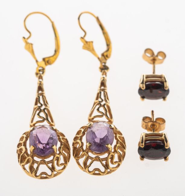 Two pairs of gem-set earrings, including a pair of 9ct gold stud earrings, each set with an oval-cut garnet, post & butterfly fitting, posts UK hallmark, odd butterflies, one marked 375, 1.5grams; and a pair of ornate openwork drop earrings, each set with an oval-cut amethyst, later added hook fittings, unmarked, length approx. 4.5cm, 4.1grams, (2).