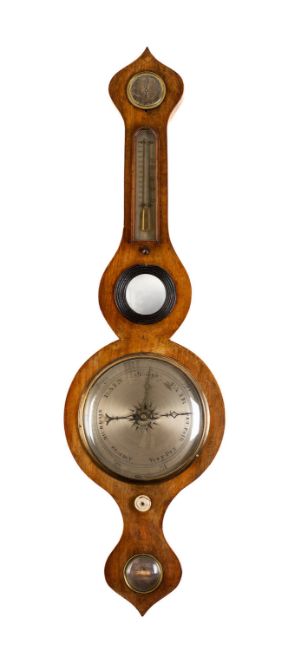 An oak five-dial wheel barometer the eight-inch silvered dial with usual barometer markings, the oak onion-top case set with a hygrometer, thermometer, butler's mirror and level, height 100cm.
