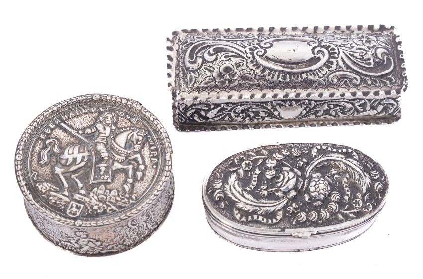 A Victorian silver dressing table pin box by I.H, Birmingham 1897, of rectangular embossed form, 65gms., with a Dutch silver and silver plated box with hinge lid and a nickel silver oval snuff box, (3)