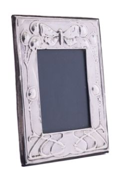 An Elizabeth II Art Nouveau style silver photograph frame by Keyford Frames Ltd, London 1983, of rectangular form, internal 12x8cms, with blue velvet back and easel