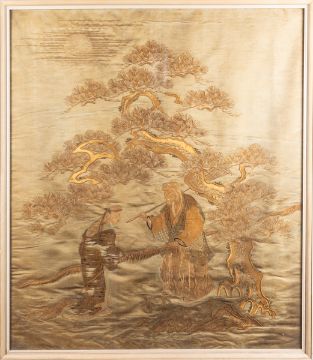 An Oriental silk embroidered panel depicting two figures greeting each other under a large pine tree, 76 x 65cm [some damage and fading] framed.
