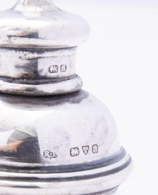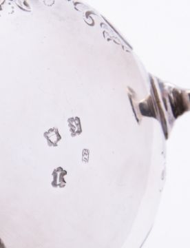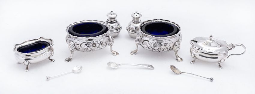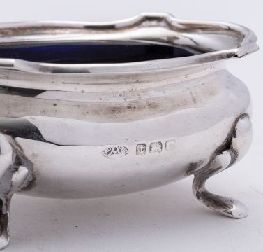 A mixed group of silver including; a pair of George II silver cauldron salts by David Field, London 1746, with later decoration and blue glass liners, a Birmingham mustard pot and open salt, two cruet spoons, a Chester salt and pepper, 275gms. (8.8ozs.), gross, (7)