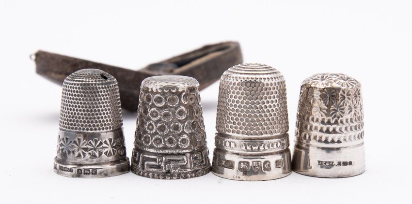 A group of antique sewing accessories including; a Chester silver thimble by James Walker Ltd, Chester 1928, size 18, ' James Walker. The London Jeweller.' 8gms. a cased silver thimble and a silver plated thimble, (4)