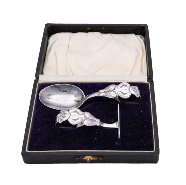 A George V silver child's pusher and spoon by Crisford & Norris Ltd, Birmingham 1926, decorated with teddy bears, cased, 35gms, (2)