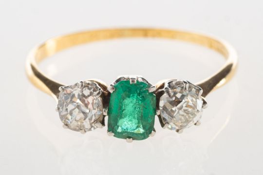 An emerald and diamond ring, set to the centre with an emerald-cut emerald, with a cushion-cut diamond set each side, diamonds approx. 0.80 carat total, indistinct mark 18ct, size O1/2 to P, 2.0grams. (Note: the emerald is chipped under one claw and has facet and girdle edge abrasions and small nicks).