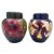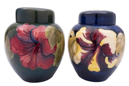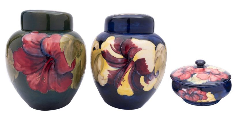 Two Walter Moorcroft pottery jars and covers tube lined in the Hibiscus pattern reserved on a blue and green ground respectively, 20cm high, together with a powder box and cover in the same pattern, 12.5cm impressed or painted marks with Royal Warrant labels. [3]