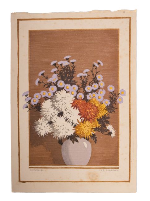 BOXSIUS, Sylvan G (1878-1941). 'October', woodcut still life in colour, signed and titled in pencil, 30.5cm x 20.5cm.