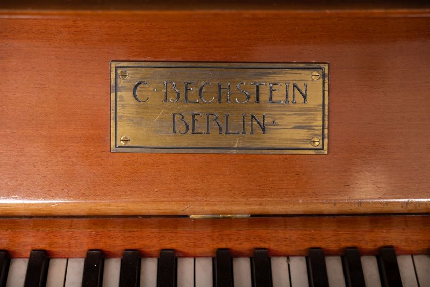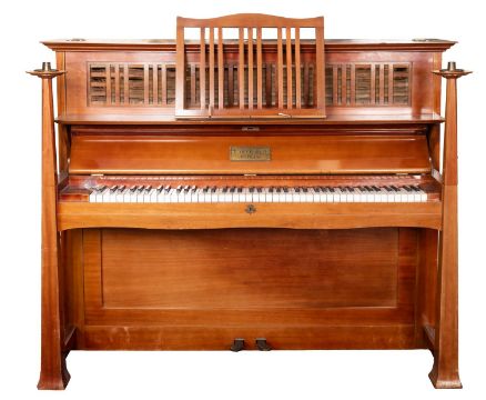 Walter Cave (designer), for Bechstein, a 'Medieval Model' upright mahogany piano in Arts & Crafts style, circa 1895; with a raised candlestick with copper sconce at each side of the keyboard; the keyboard cover and top with strapwork hinges; the keyboard cover underside with brass maker's plaque 'C.BECHSTEIN, BERLIN'; the upper edge of the right side stamped 'RD. 328639, USA PATENT 24805'; 130cm high overall, 152cm wide, 66cm deep overall. 'Please note: the Ivory Sale Licence reference for this lot is 21S1KUZN