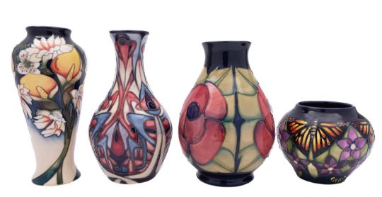 Four Moorcoft pottery vases, comprising Monarch Butterfly modelled after the original by Emma Bossons, impressed and painted marks and dated 2015, 11cm high; Centenarian for Liberty of London, modelled after the original by Emma Bossons, impressed, printed and painted marks, dated 2002 and numbered 22/100, 21cm high; Royal Wedding, impressed and painted marks and dated 2013, 21cm high and Rose modelled after the original by Sally Tuffin, impressed and painted marks, 20cm high.