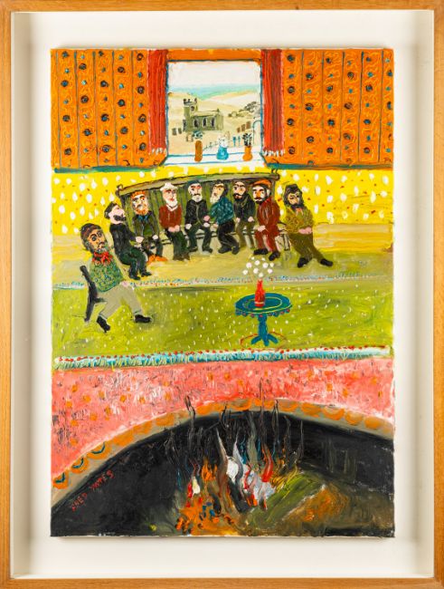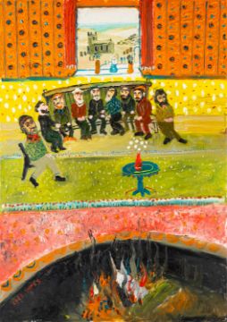 *Fred Yates (British, 1922-2008) -By the Fireside in the Gloaming: An Old Song (scene in The Star Inn, St Just) -Oil on canvas -90 x 64cm - 111 x 83.5cm framed -Signed lower left -Inscribed on the stretcher with title and 'This is typical Fre (sic) Yates simple & happy. A beautiful memory', followed by three heart signs