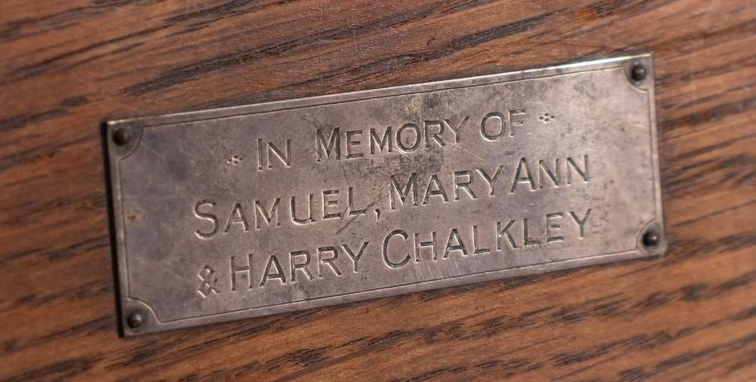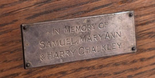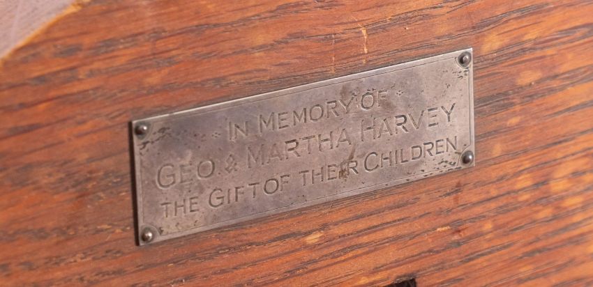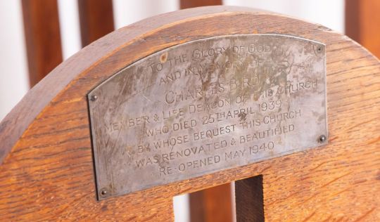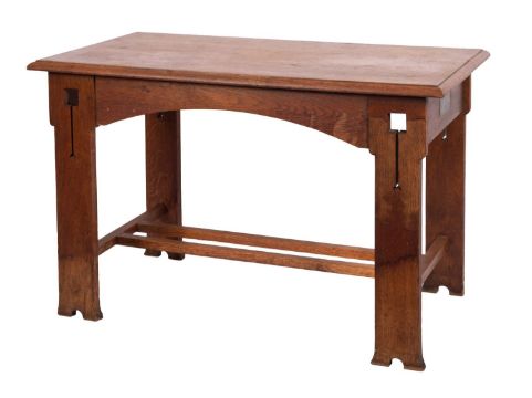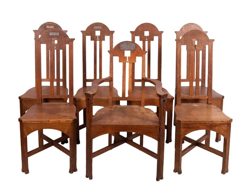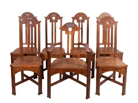 A set of seven oak chairs in Arts and Crafts style, early 20th century; including one elbow chair, the openwork back rests all with vertical splats to pierced crestings; the elbow chair 97cm high, 60cm wide; and a side table en suite, 77cm high, 122cm long, 68cm wide; all items with various later applied silver plated commemorative plaques