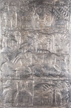 Asiru Olatunde, Nigerian (1918 - 1993) a repousse worked aluminium figural panel; with tribesmen and animals amongst trees in eight rectangular reserves, inscribed ASIRU OLATUNDE OSOGBO to the lower edge; 92cm high, 61.5cm wide