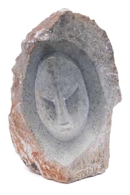 An African soapstone or steatite sculpture in the form of a stylised visage, signed J. Type, 21cm high.