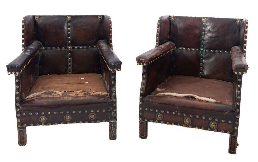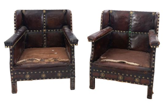 A pair of studded leather wing armchairs in Aesthetic Movement style, circa 1900; with rectangular backs and straight padded arms; above short, straight legs; 82cm high, 70cm wide, 77cm deep