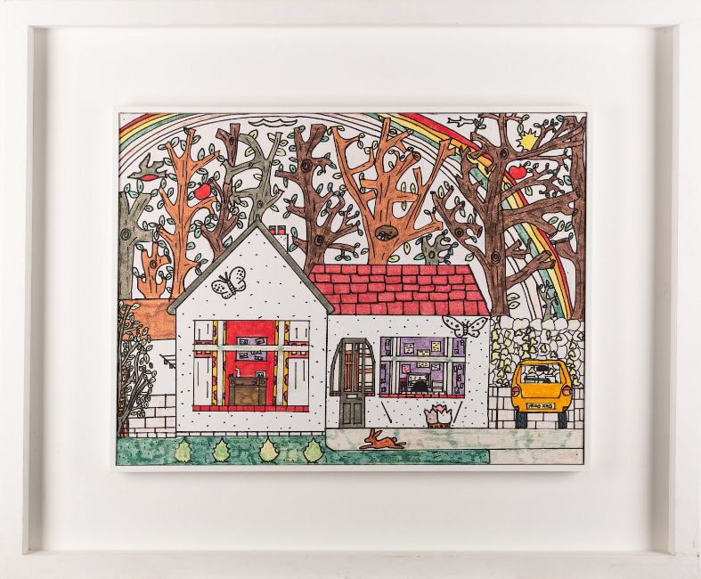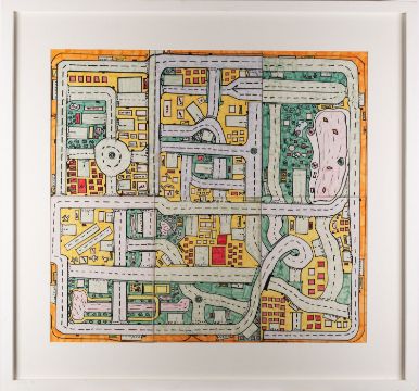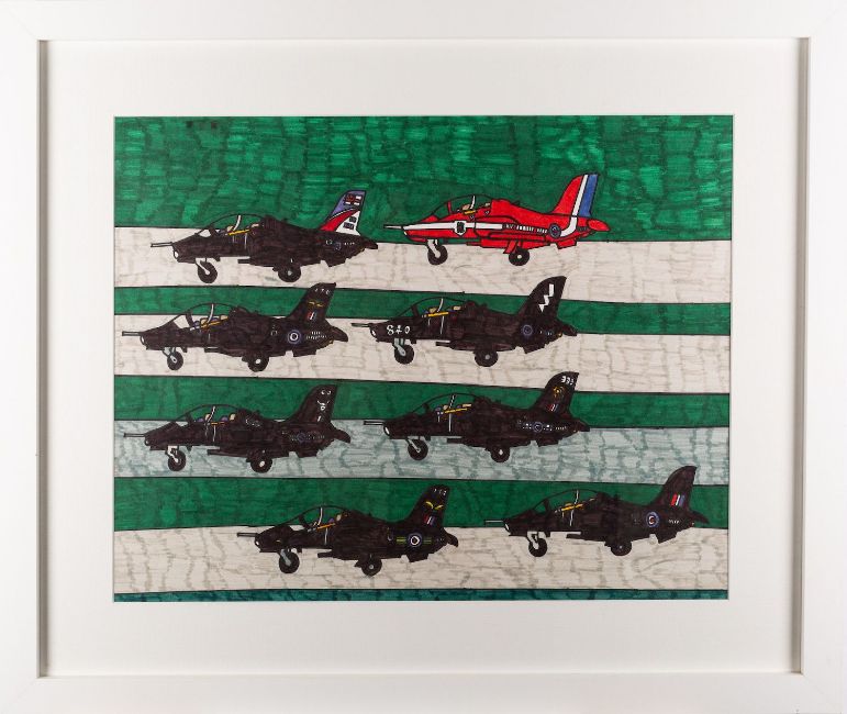 Contemporary School -Air Force aircraft -Marker pen drawing -38 x 48.5cm -Together with further marker pen drawing of a bird's eye view of a city, 62 x 57cm, and two smaller garden scenes (4)
