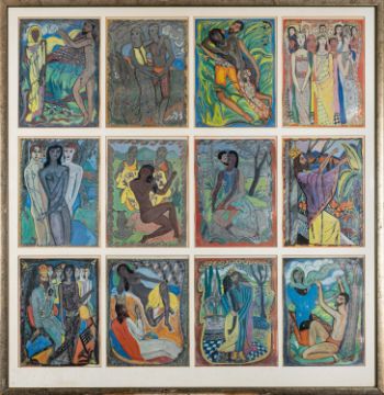 *Edward Wolfe RA (South African/ British, 1897-1982) -Song of Songs -Set of twelve offset lithographs on aluminium lined paper, in four colours and matt varnish, framed as one -130 x 127cm framed -Designed in 1930, printed by Adrian Lack at the Senecio Press, 1980 -Provenance: Patrick Seale Gallery, London; The Millinery Works, London; By descent from James (Jim) O'Connor, Edward Wolfe's partner