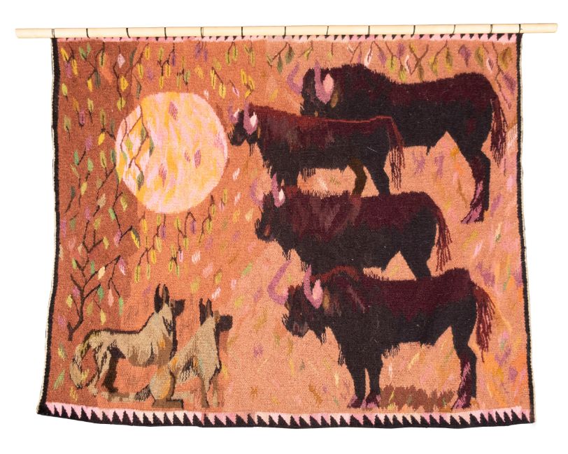 Naomi Semele (Botswanan, late 20th century), a hand woven tapestry representing cattle and hounds in a landscape, 117cm high, 140cm wide excluding wooden hanging rail; with a certificate dated 1975 and pamphlets relating to the artist