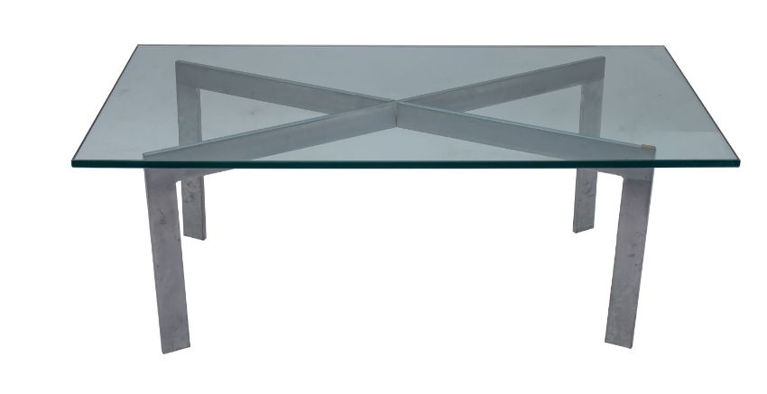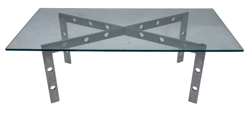 Two Artemide polished aluminium and glass coffee tables, the rectangular glass tops raised on pierced square section legs, (one with multi pierced frame); 122x61x40cm (2)