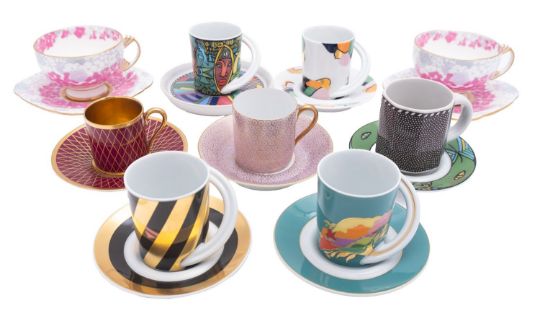Seven Rosenthal espresso cups and saucers, including four Studio Line examples, variously decorated, together with a pair of Wedgwood Deco Bloom teacups with saucers.