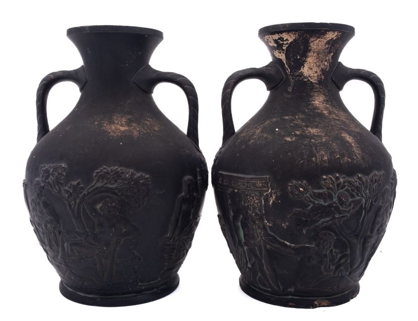 Two black painted terracotta Portland vases both marked 'N&H 68', 22cm [minor damage].