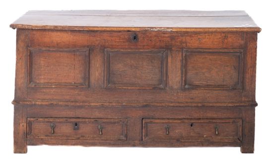 An 18th Century oak rectangular dower chest, with a hinged moulded top and triple panelled front, containing two moulded panel drawers below, on block feet, 128cm width, 65cm height, 51cm depth.
