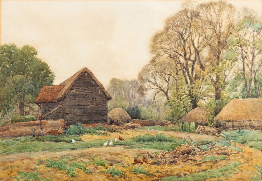 Alfred Fontville de Breanski Junior (British, 1877-1957) - A Berkshire farmyard - Watercolour - 36 x 50.5cm - 55 x 69cm framed - Titled and signed in pencil to a label attached to the backing
