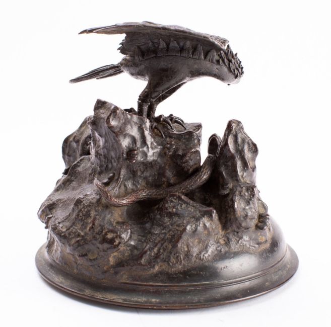 A large Japanese bronze Koro cover, Meiji period in the form of an eagle attacking a snake on a rocky outcrop, 20cm wide.