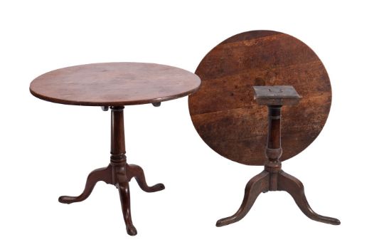 Two George III oak tripod tables, circa 1760; with circular flip tops, gun barrel stems and splayed legs; the larger example 72cm high, 87cm diameter; (damages and adaptions)