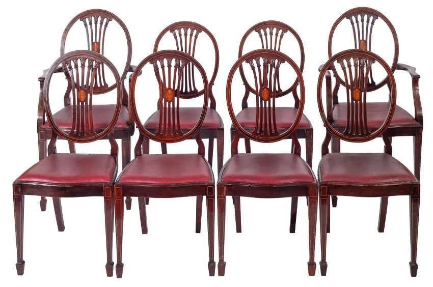 A set of eight Edwardian mahogany and inlaid dining chairs, in the Sheraton manner, bordered with boxwood lines, the oval backs with pierced central splats and carved foliate crestings centred by oval stylised foliate panels, having upholstered slip in serpentine seats in simulated crimson leather, on square tapered legs, terminating in spade feet - including a pair of elbow chairs (8).