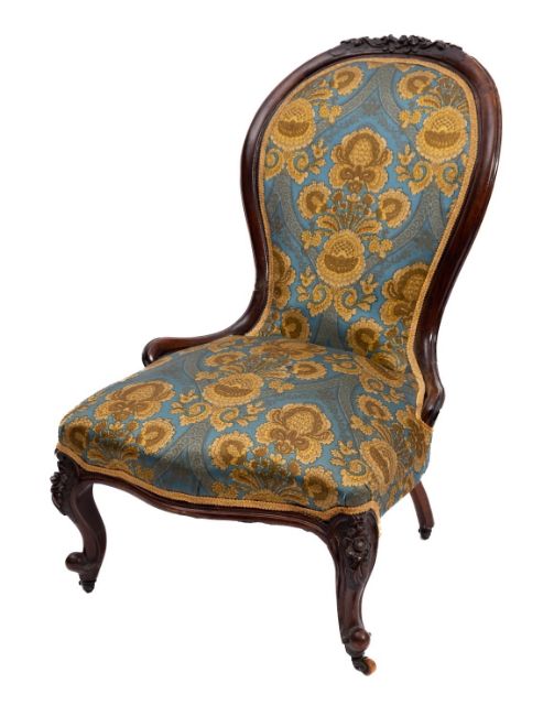 A Victorian carved walnut and upholstered nursing chair, circa 1870; the show frame with floral carved toprail and cabriole front legs; 92cm high, 59cm wide