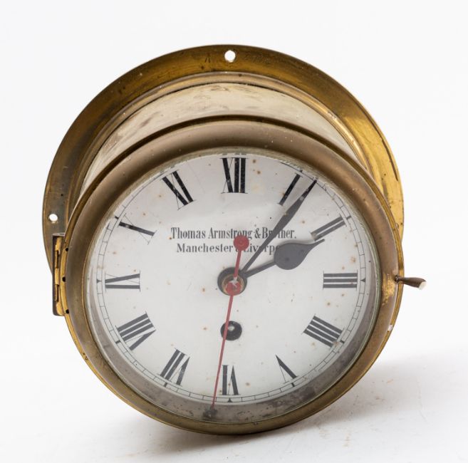 Thomas Armstrong & Brother, a brass bulkhead clock having an eight-day duration timepiece movement with platform escapement, the round white enamel dial having black Roman numerals, blued-steel spade hands, a red sweep seconds hand and signed Thomas Armstrong & Brother, Manchester & Liverpool, in round brass bulkhead case, diameter 20cm case, 22.5cm including flange. Joseph Armstrong (d. 1851) at 261 Deansgate, Manchester in 1825, later renumbered as 88. Married Sarah Booth in 1828 and had three sons named Thomas, George and Alfred with Thomas becoming a partner in 1851. In 1868 Thomas took his brother, George Booth, into partnership and changed the company's name to Thomas Armstrong & Brother, expanding the business with shops in Oxford Street, Manchester and Bold Street, Liverpool.