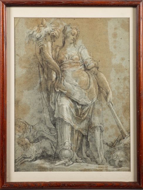 After Federico Zuccaro (Italian, c. 1542-1609) - Personification of Peace - Black and white chalk on blue paper, laid on another sheet of blue paper - 35.5 x 27.5cm - Provenance: Sotheby's New York (Jan 1983) - The lot is a copy after a drawing in the Ecole des Beaux-Arts in Paris, which itself is a version of the original held in the Royal Collection, London.