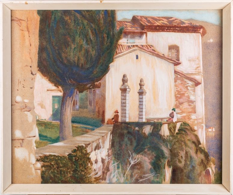 *Hugh Gresty (British, 1899-1958) - View in Italy with a costal villa - Watercolour - 50 x 60cm - Signed lower left