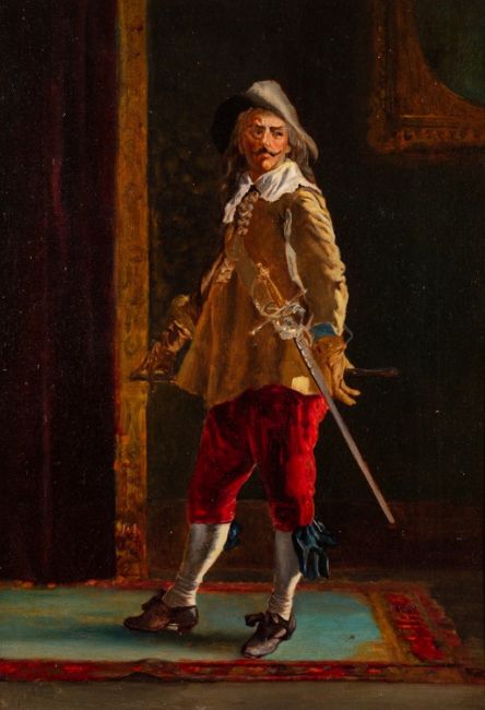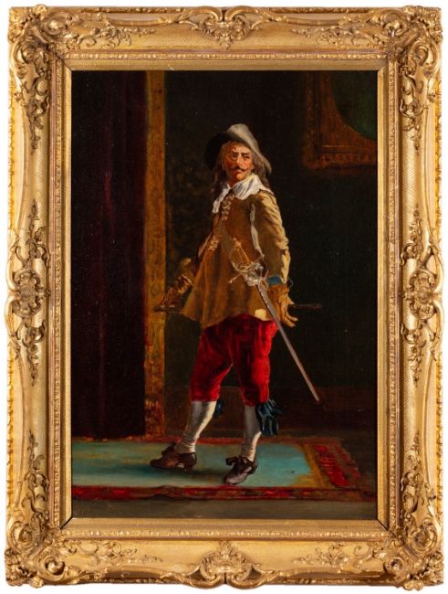 Follower of Jean-Louis-Ernest Meissonier (French, 1815-1891) - Standing Cavalier - Oil on canvas - 48.5 x 33cm - 62.5 x 47.5cm framed