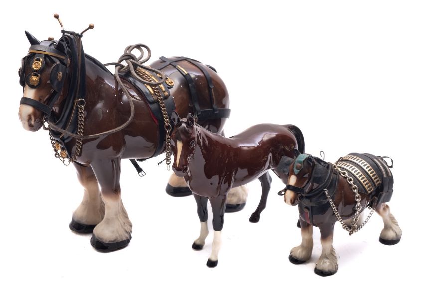A Melba Ware model of a Shire horse, 29cm high, together with another smaller and a model of a Chestnut horse (3)