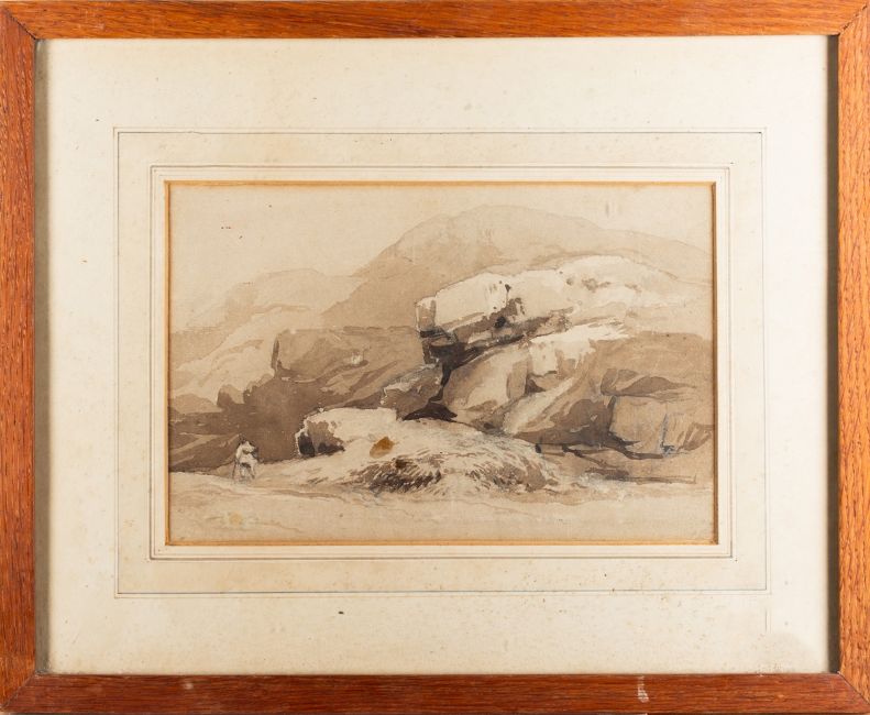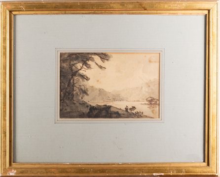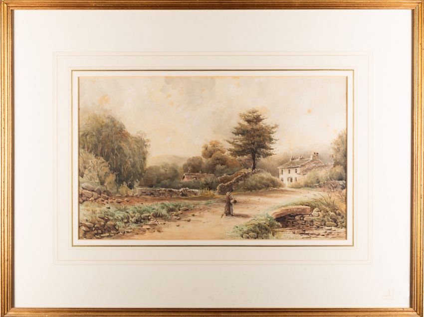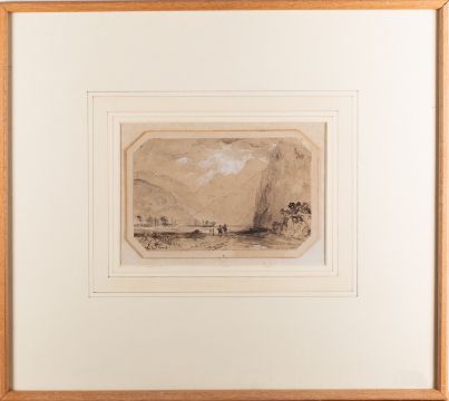 A group of seven landscapes comprising - British School (18th Century), Strawbing on the Danube and an upland lake scene, two pencil and watercolour drawings, 11.5 x 17cm and 10 x 16cm respectively, each initialled 'LFL' - Attributed to William Gilpin (1724-1804), pair of Highland scenes with lochs, two pen and ink wash drawings, each 12 x 18cm - 19th Century School, traveller in the Highlands, pen and ink wash, 17 x 25cm - F. Walters (19th century), Old Mill Creek, River Dart, watercolour, 10 x 15.5cm, signed, Provenance. With Peter Cardiff Fine Art, Stokenchurch St, London - J. Tetlow (late 10th century), A figure on a country road, watercolour, 24 x 39cm, 47 x 62cm framed, signed and dated (7)