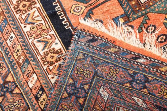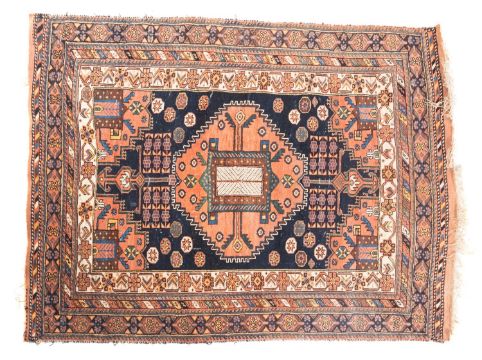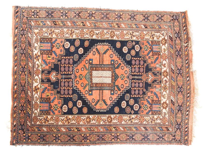 A late 19th Century Afshar rug, the indigo field with a large central serrated rose octagonal pole medallion, similar spandrels and stellar motifs, enclosed by a main ivory cruciform and chevron border, 164cm x 126cm.