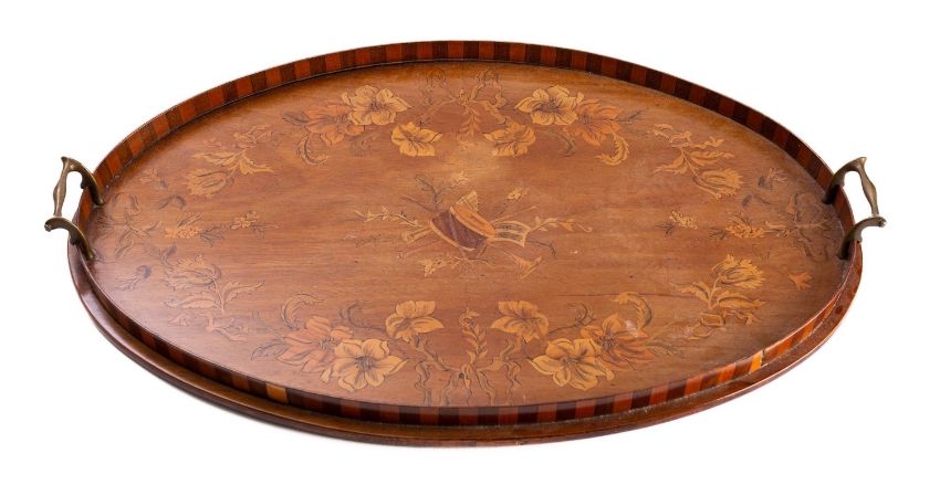 A George III mahogany and marquetry oval tray, early 19th century; decorated with a central musical trophy within a floral border; a brass handle at each end; 5cm high, 56cm wide