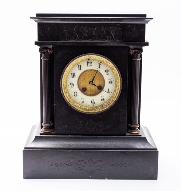 A black slate mantel clock having an eight-day duration movement with an anchor escapement and striking the hours and half-hours on a gong, the round cream dial having black Arabic numerals, blued-steel trefoil hands and an engraved gilt-brass centre, the black marble case with a bronzed frieze to the top depicting classical musicians and fluted pillars to the corners, height 39.5cm.