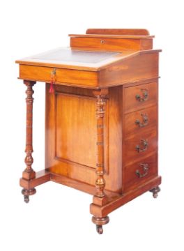 An Edwardian mahogany Davenport. early 20th century; the superstructure with hinged cover and fitted within for stationery; the sloping top with inset tooled leather skiver and opening to maple lining; above twin turned supports and drawers to one side; on turned feet with ceramic castors; 87cm high, 55cm wide